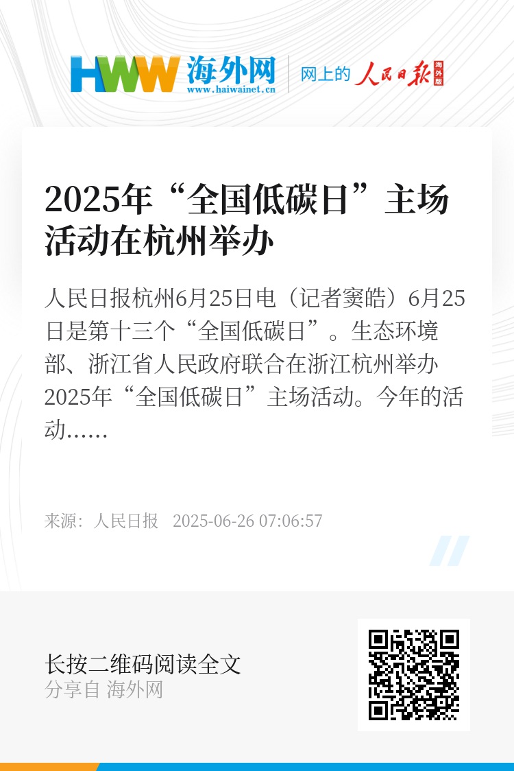 人民日报杭州6月25日电(记者窦皓)6月25日是第十三个“全国低碳日”。生态环境部、浙江省人民政府联合在浙江杭州举办2025年“全国低碳日”主场活动。