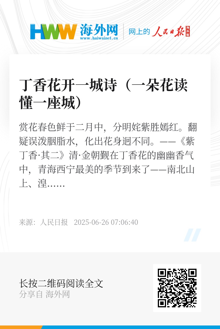 地处黄土高原向青藏高原的过渡地带,西宁高寒且干旱,丁香成为当地为数不多兼具绿化、美化、香化功能的树种。耐寒耐旱耐贫瘠的特性,让它在西宁这片海拔2000多米的土地上舒展盛放,契合当地人坚韧、朴实的气质。同时,丁香花色淡雅、花型繁密、香气浓郁,也被视为幸福吉祥、繁荣兴盛的象征。
