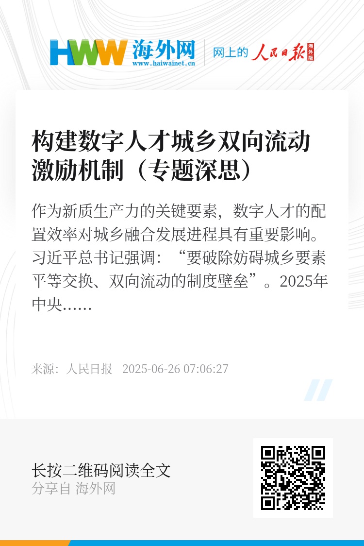 作为新质生产力的关键要素,数字人才的配置效率对城乡融合发展进程具有重要影响。习近平总书记强调:“要破除妨碍城乡要素平等交换、双向流动的制度壁垒”。2025年中央一号文件提出:“鼓励和引导城市人才服务乡村,健全评聘激励机制。”数字人才具有城乡空间配置弹性,其流动呈现城乡双向可迁移性。当前,城乡数字人才存在结构性失衡的矛盾,破解的关键在于构建数字人才城乡双向流动激励机制。通过政策协同、分配优化、产业联动等,让数字人才在城乡间敢流动、愿流动、流得动,形成人尽其才、才尽其用、用有所成的人才发展格局,既为推进乡村全面振兴注入数字动能,也为发展新质生产力筑牢人才基石。