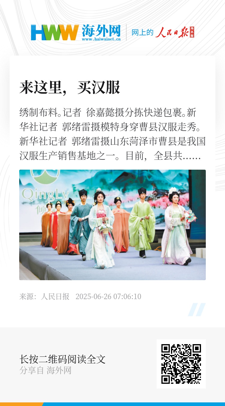 曹县以汉服、电商为依托,形成涵盖原创研发、设计制作、版权保护、裁剪打版、绣花印花、展演展示及网络营销等的完整产业链条。如今,曹县汉服产业正向规模化、品牌化、高端化跃升,曹县汉服不仅在国内市场大放异彩,更远销海外,向世界展现中国服饰文化的独特魅力。(人民日报通讯员 王 亮)