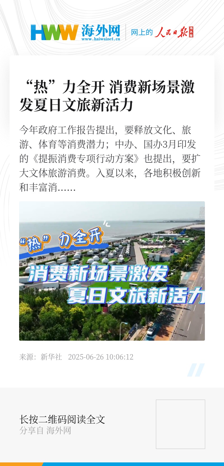 入夏以来,各地积极创新和丰富消费场景,以游客的个性化、品质化需求牵引旅游服务持续完善,以多元供给激发消费潜力和市场活力。