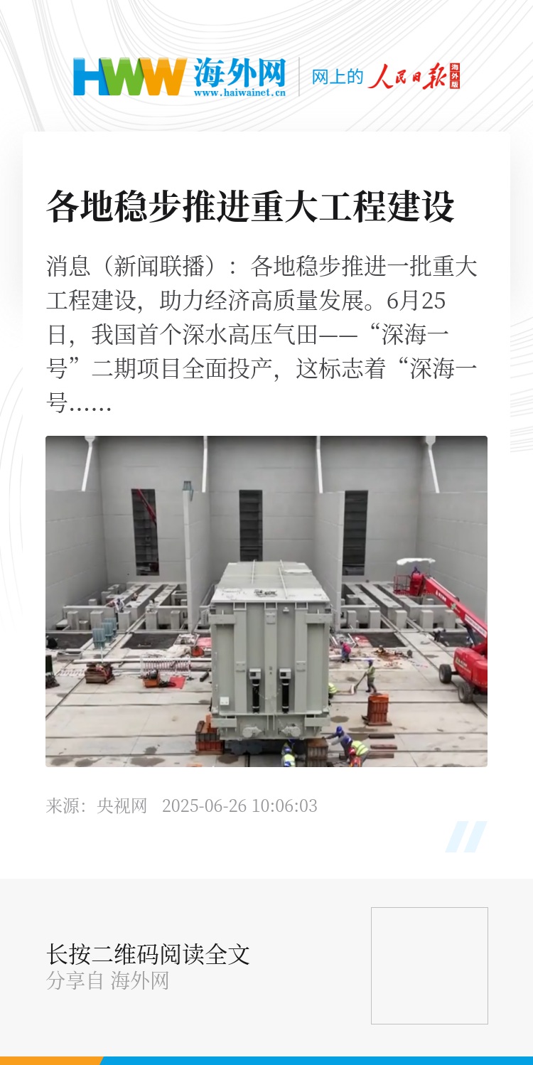 央视网消息(新闻联播):各地稳步推进一批重大工程建设,助力经济高质量发展。