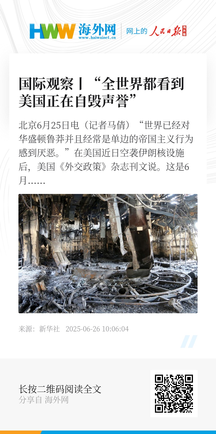 新华社北京6月25日电(记者马倩)“世界已经对华盛顿鲁莽并且经常是单边的帝国主义行为感到厌恶。”在美国近日空袭伊朗核设施后,美国《外交政策》杂志刊文说。