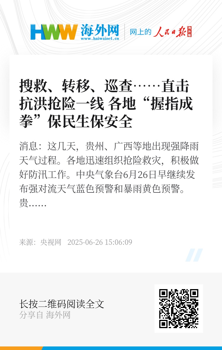 央视网消息:这几天,贵州、广西等地出现强降雨天气过程。各地迅速组织抢险救灾,积极做好防汛工作。中央气象台6月26日早继续发布强对流天气蓝色预警和暴雨黄色预警。
