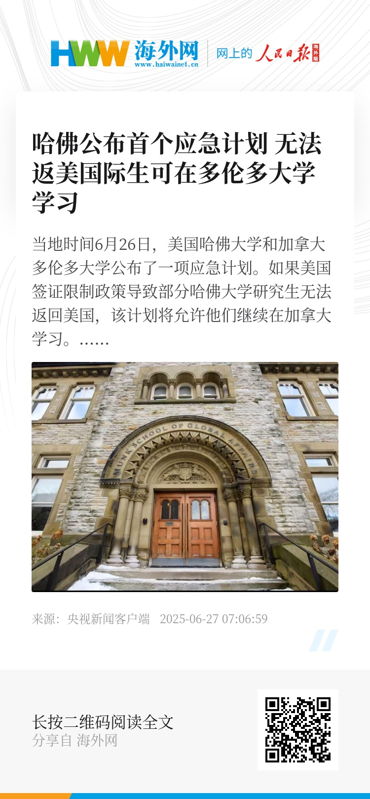当地时间6月26日,美国哈佛大学和加拿大多伦多大学公布了一项应急计划。如果美国签证限制政策导致部分哈佛大学研究生无法返回美国,该计划将允许他们继续在加拿大学习。这是自美国国土安全部上月取消哈佛大学招收国际学生资格以来,哈佛大学宣布的首个国际学生应急计划。