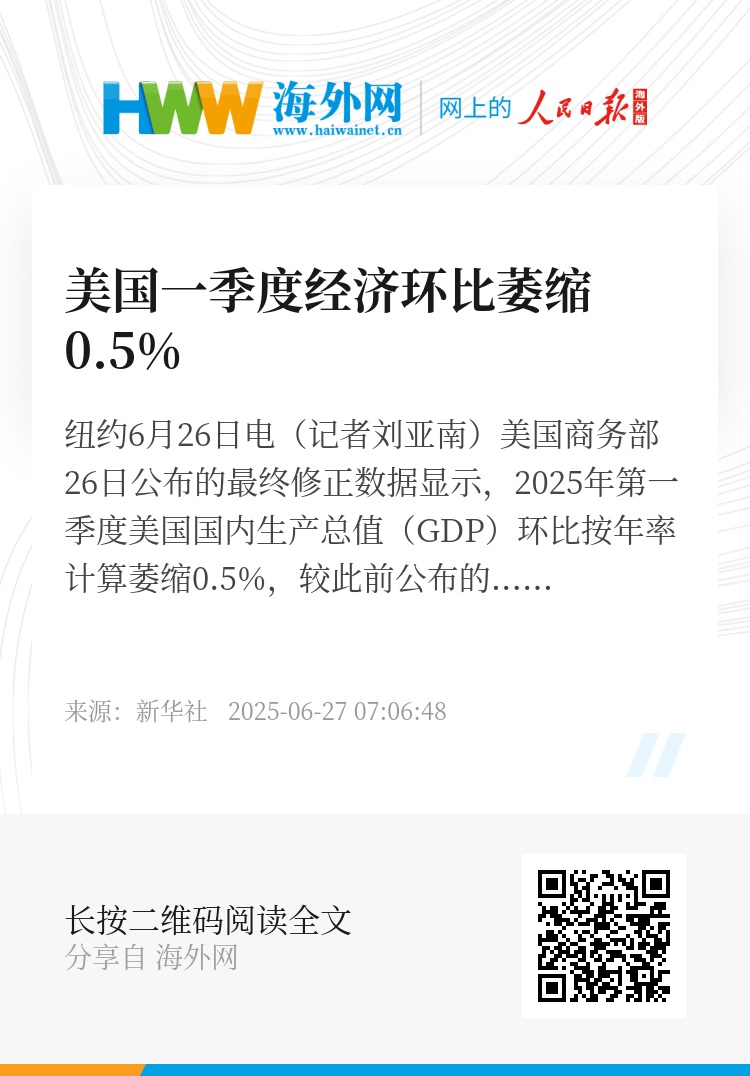 新华社纽约6月26日电(记者刘亚南)美国商务部26日公布的最终修正数据显示,2025年第一季度美国国内生产总值(GDP)环比按年率计算萎缩0.5%,较此前公布的初次估值和修正值明显下调。