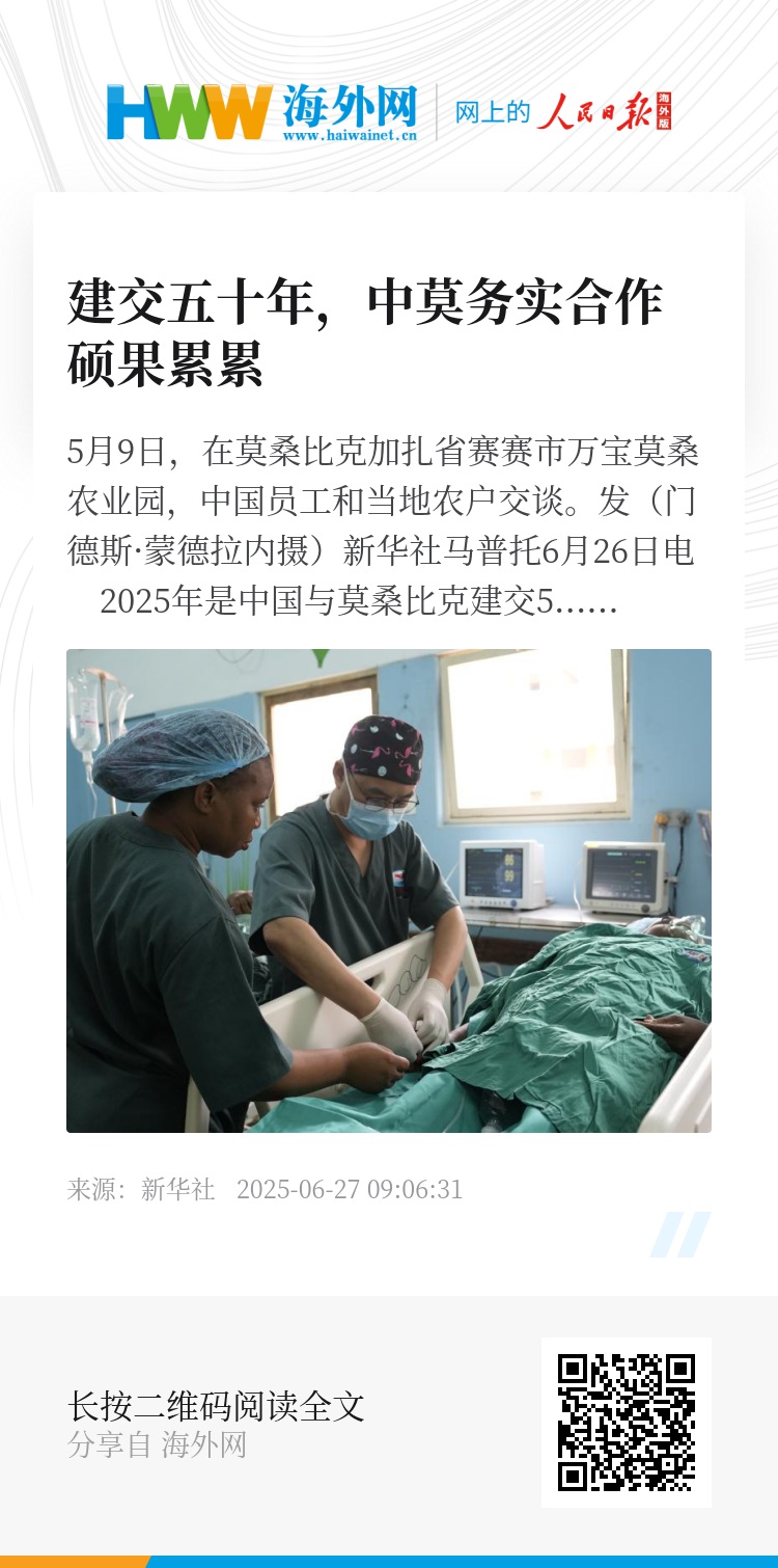 新华社马普托6月26日电 2025年是中国与莫桑比克建交50周年。半个世纪以来,中莫彼此信赖、相互支持,双方在基础设施、农业发展和教育培训等领域持续深化合作,为莫国家建设和民生改善带来了实实在在的变化。