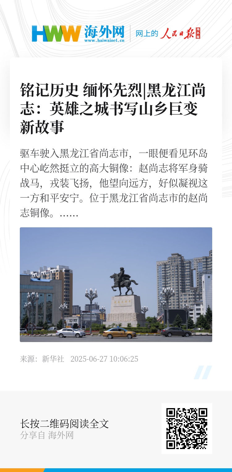 尚志市是一座以东北抗联英雄赵尚志命名的城市。昔年,赵尚志、赵一曼等无数抗联将士在此抵御外辱,“南杨(杨靖宇)北赵(赵尚志)”“双枪白马”女政委等赫赫威名令敌人闻风丧胆。而今,这片红色沃土正日新月异展现着新的活力。