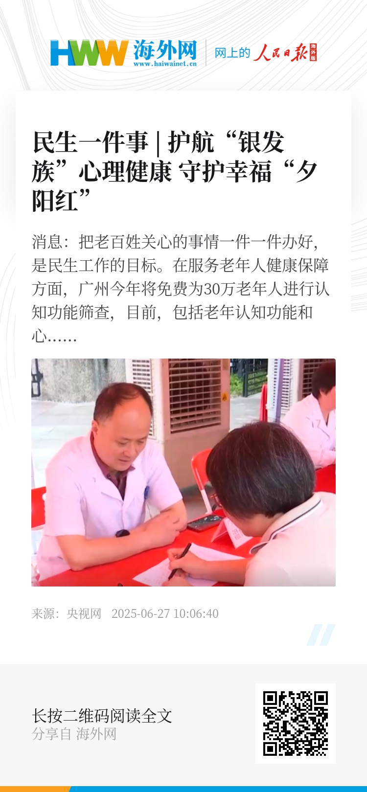 央视网消息:把老百姓关心的事情一件一件办好,是民生工作的目标。在服务老年人健康保障方面,广州今年将免费为30万老年人进行认知功能筛查,目前,包括老年认知功能和心理健康等项目筛查正持续进行。