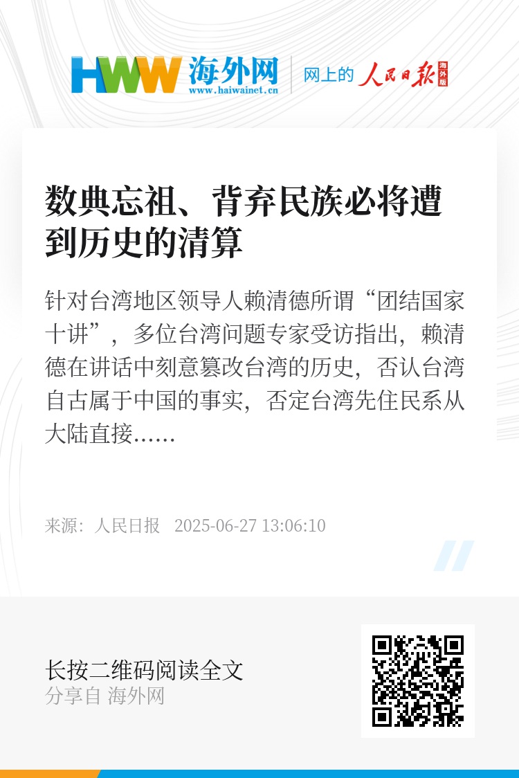 针对台湾地区领导人赖清德所谓“团结国家十讲”,多位台湾问题专家受访指出,赖清德在讲话中刻意篡改台湾的历史,否认台湾自古属于中国的事实,否定台湾先住民系从大陆直接或间接移居而来,罔顾中国历代政府管辖台湾的事实,是对历史的歪曲和践踏。历史不容篡改,事实不容否认,是非不能颠倒。有关台湾的全部历史、事实和法律证明,台湾自古是中国领土不可分割的一部分,数典忘祖、背弃民族必将遭到历史的清算。