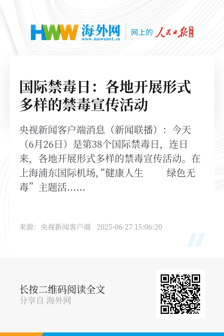 央视新闻客户端消息(新闻联播):今天(6月26日)是第38个国际禁毒日,连日来,各地开展形式多样的禁毒宣传活动。在上海浦东国际机场,“健康人生 绿色无毒”主题活动通过文艺演出、沉浸式参观等形式向过往旅客普及禁毒知识。在江苏苏州,林则徐纪念馆今天向公众开放,并举行了“携手禁毒筑防线 同心护安向未来”的主题活动,宣传禁毒历史知识。在辽宁沈阳、湖北武汉、青海西宁、河北雄安、四川广安等地,禁毒部门组织开展了“禁毒健康跑”和“禁毒主题展”,增强群众特别是青少年识毒、防毒、拒毒的能力。