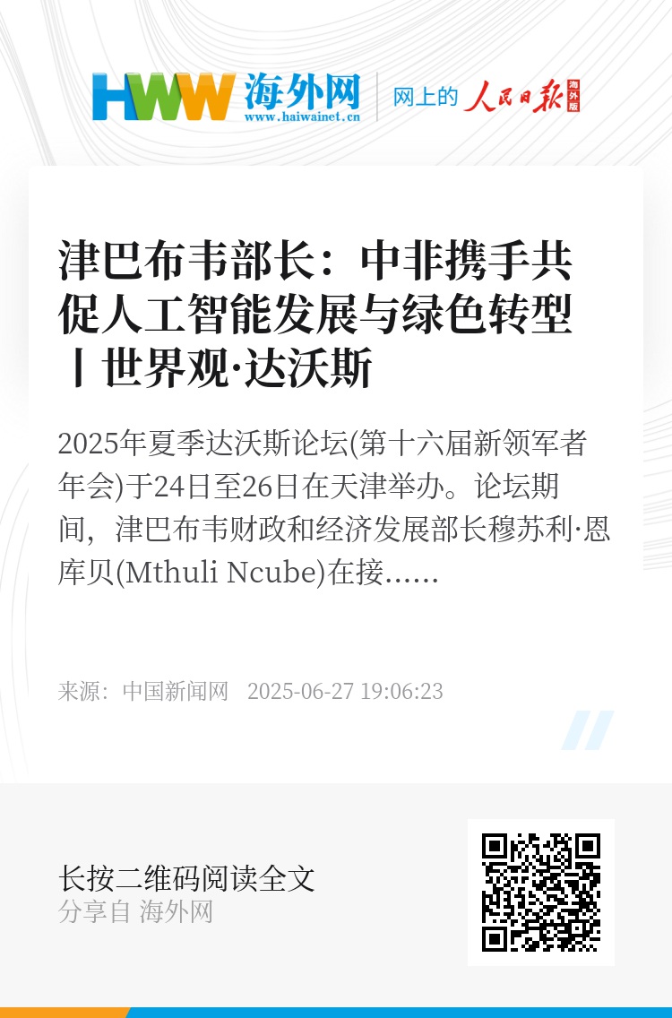 2025年夏季达沃斯论坛(第十六届新领军者年会)于24日至26日在天津举办。论坛期间,津巴布韦财政和经济发展部长穆苏利·恩库贝(Mthuli Ncube)在接受中国新闻网专访时表示,非洲在人工智能领域具备跨越式发展的潜力,这为非洲与中国的合作创造了可能。在绿色发展方面,非洲拥有丰富的碳汇资源,中非的合作也能推动全球经济的绿色转型。
