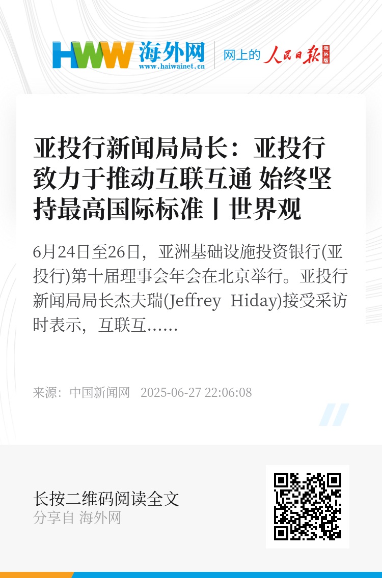 6月24日至26日,亚洲基础设施投资银行(亚投行)第十届理事会年会在北京举行。亚投行新闻局局长杰夫瑞(Jeffrey Hiday)接受中新网采访时表示,互联互通是亚投行的优先投资方向之一,通过提升互联互通,尤其是交通项目,亚投行的投资帮助人们更得到更多的就业机会,减少了碳排放,并从多方面改善了民众生活质量。谈到基础设施发展对于经济增长的重要性,他认为,中国在基础设施建设领域堪称世界典范。他指出,从几十年前人均GDP不足1000美元,到如今的显著成就,基础设施建设被广泛认为是推动中国发展的关键因素。并表示,未来,亚投行也将继续为“面向未来的基础设施”提供融资,与各成员、客户、合作伙伴一道,助力全球可持续发展和绿色转型。(黄方 赵丽)