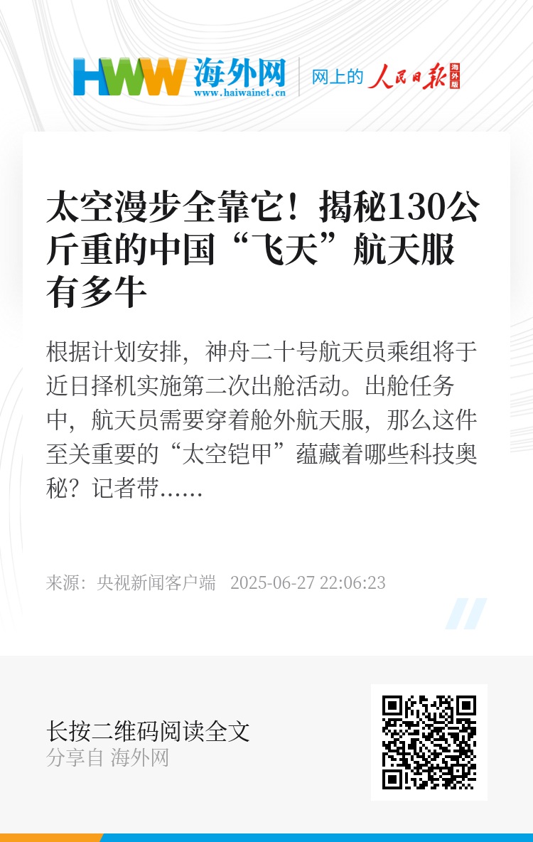 根据计划安排,神舟二十号航天员乘组将于近日择机实施第二次出舱活动。出舱任务中,航天员需要穿着舱外航天服,那么这件至关重要的“太空铠甲”蕴藏着哪些科技奥秘?记者带您一探究竟。