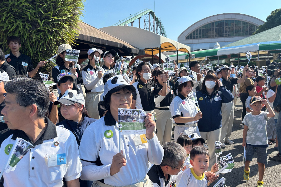 大批来自日本各地的大熊猫粉丝一早来到游乐园,为它们送行。