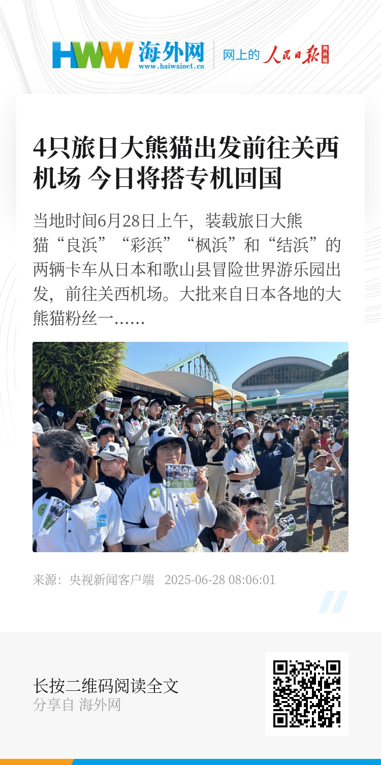 当地时间6月28日上午,装载旅日大熊猫“良浜”“彩浜”“枫浜”和“结浜”的两辆卡车从日本和歌山县冒险世界游乐园出发,前往关西机场。