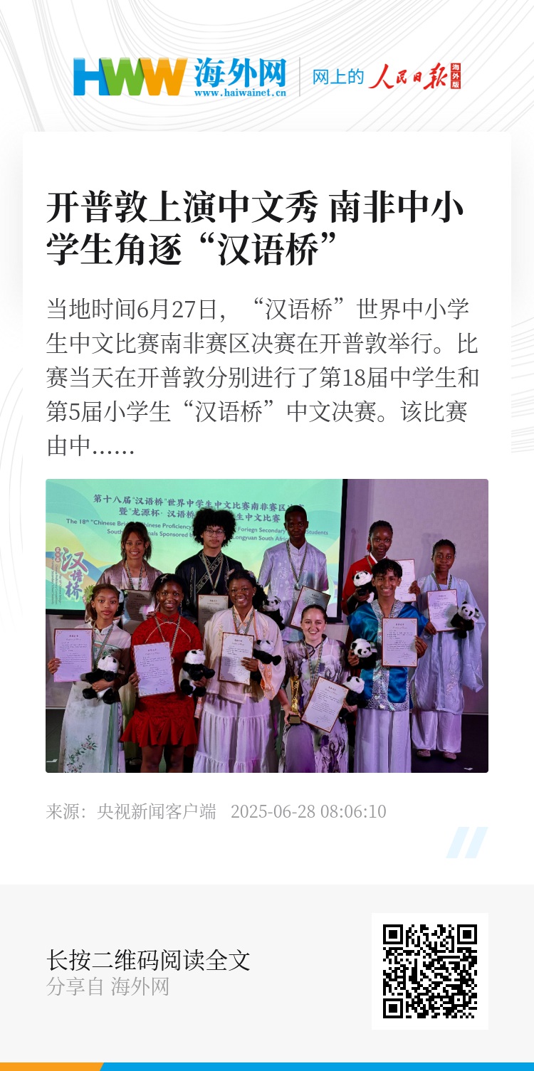 当地时间6月27日,“汉语桥”世界中小学生中文比赛南非赛区决赛在开普敦举行。