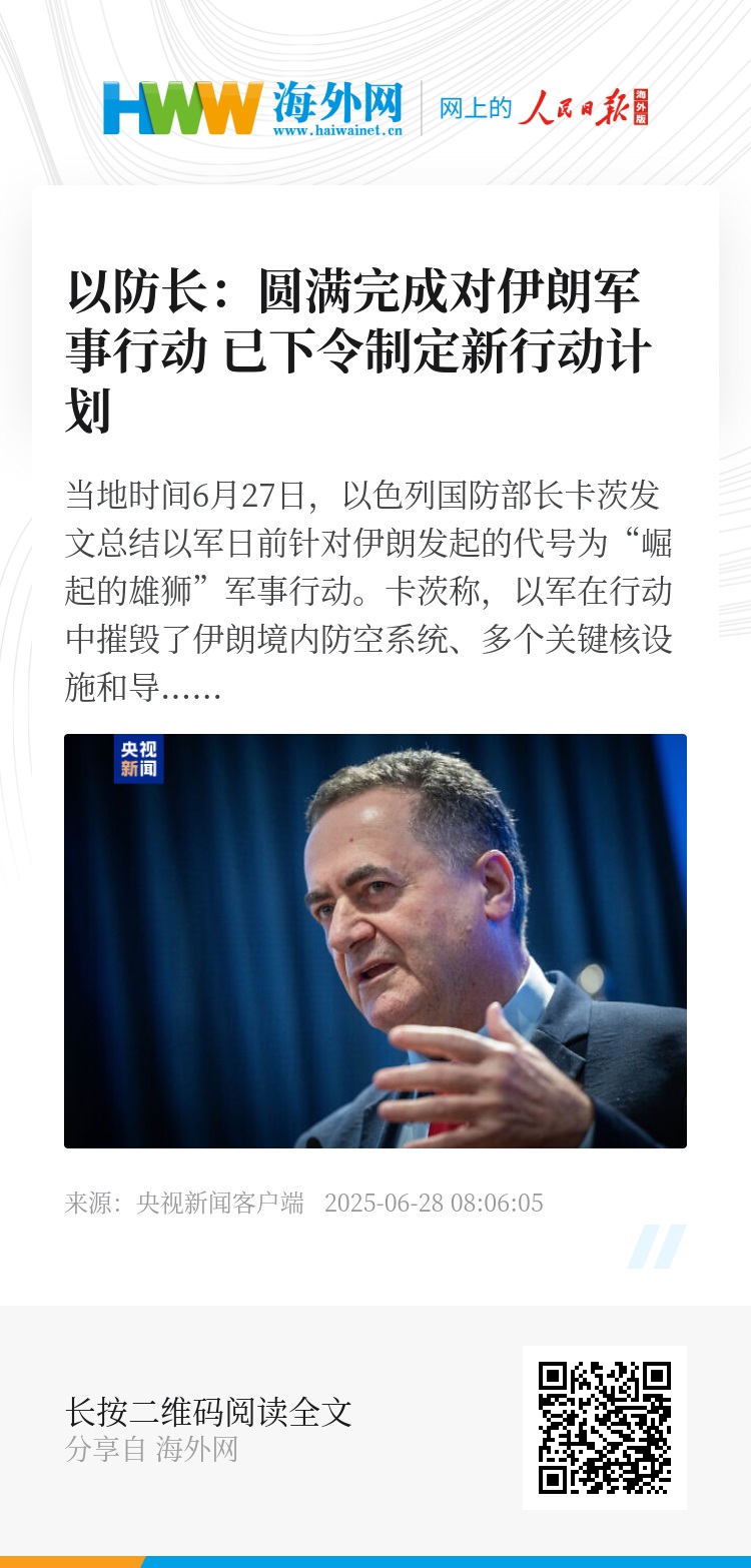 卡茨称,以色列将定期采取行动,挫败相关威胁。他同时警告伊朗方面,称“崛起的雄狮”军事行动只是以色列新政策的序幕 。(总台记者 王寅)