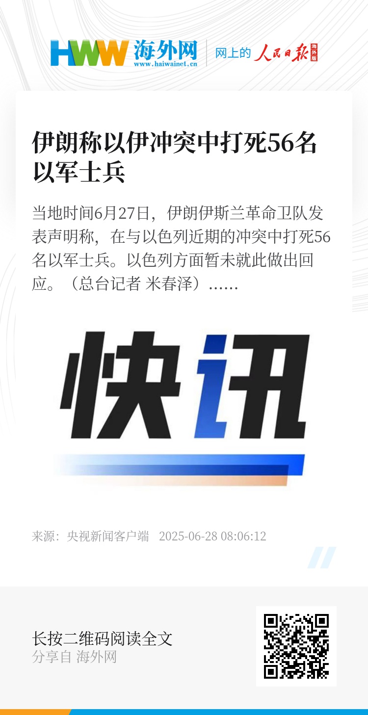 当地时间6月27日,伊朗伊斯兰革命卫队发表声明称,在与以色列近期的冲突中打死56名以军士兵。