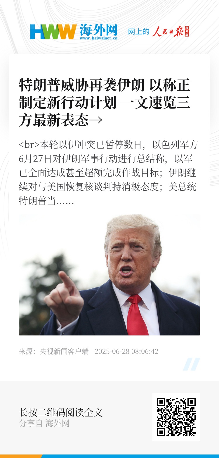 本轮以伊冲突已暂停数日,以色列军方6月27日对伊朗军事行动进行总结称,以军已全面达成甚至超额完成作战目标;伊朗继续对与美国恢复核谈判持消极态度;美总统特朗普当天扬言考虑因铀浓缩问题再次轰炸伊朗。