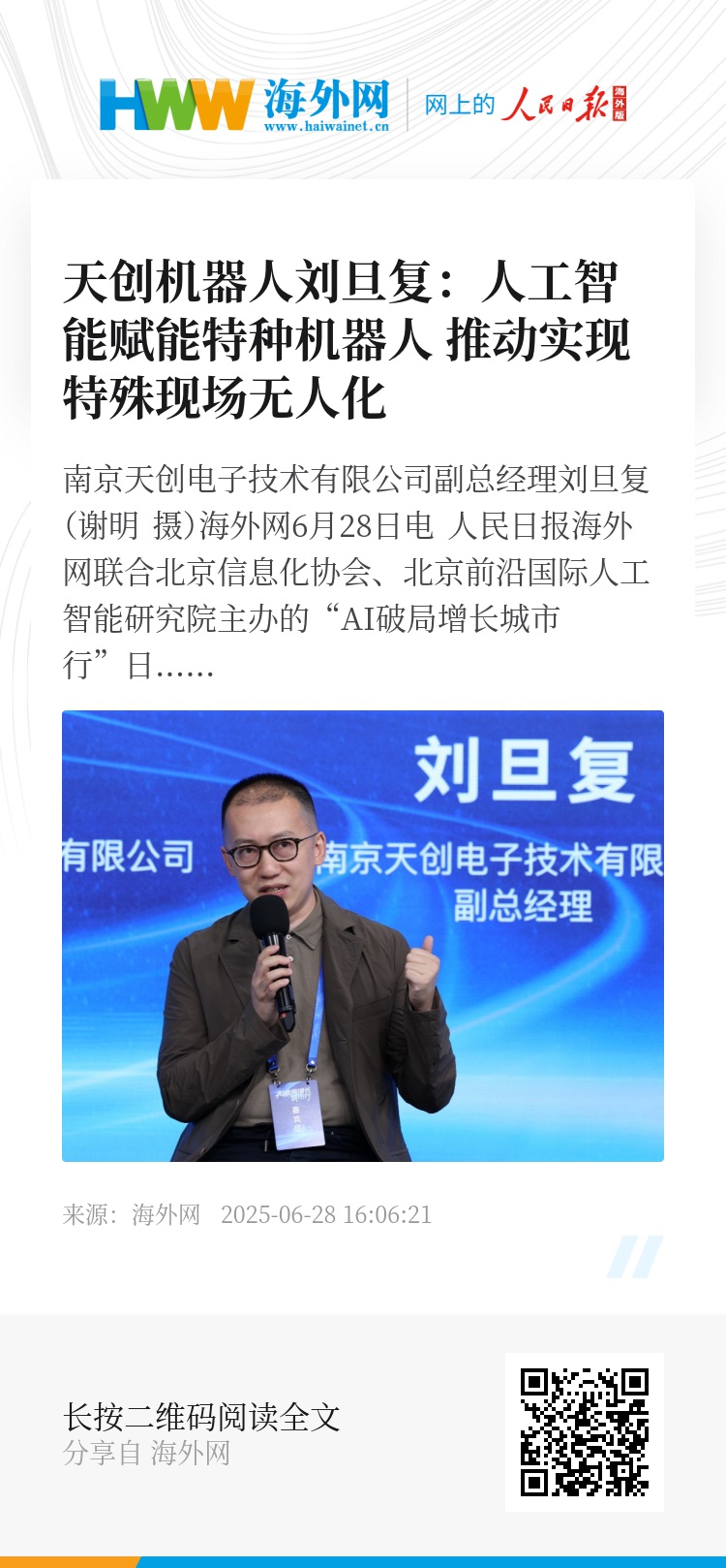 海外网6月28日电 人民日报海外网联合北京信息化协会、北京前沿国际人工智能研究院主办的“AI破局增长城市行”日前在京启动。南京天创电子技术有限公司副总经理刘旦复在启动仪式圆桌论坛环节分享了人工智能在特种机器人领域的应用场景和发展趋势。