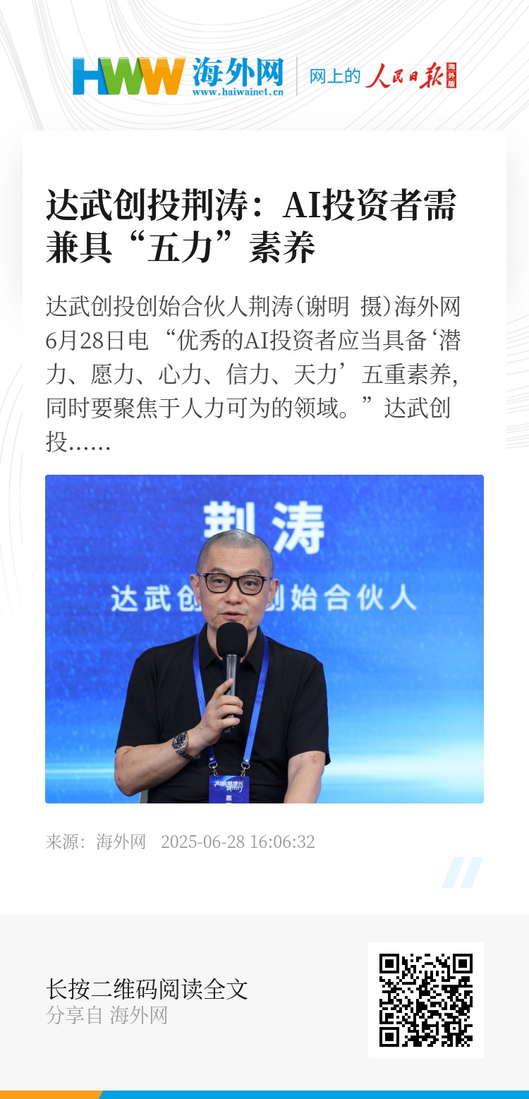 海外网6月28日电 “优秀的AI投资者应当具备‘潜力、愿力、心力、信力、天力’五重素养,同时要聚焦于人力可为的领域。”达武创投创始合伙人荆涛日前在人民日报海外网主办的“AI破局增长城市行”启动仪式上表示。