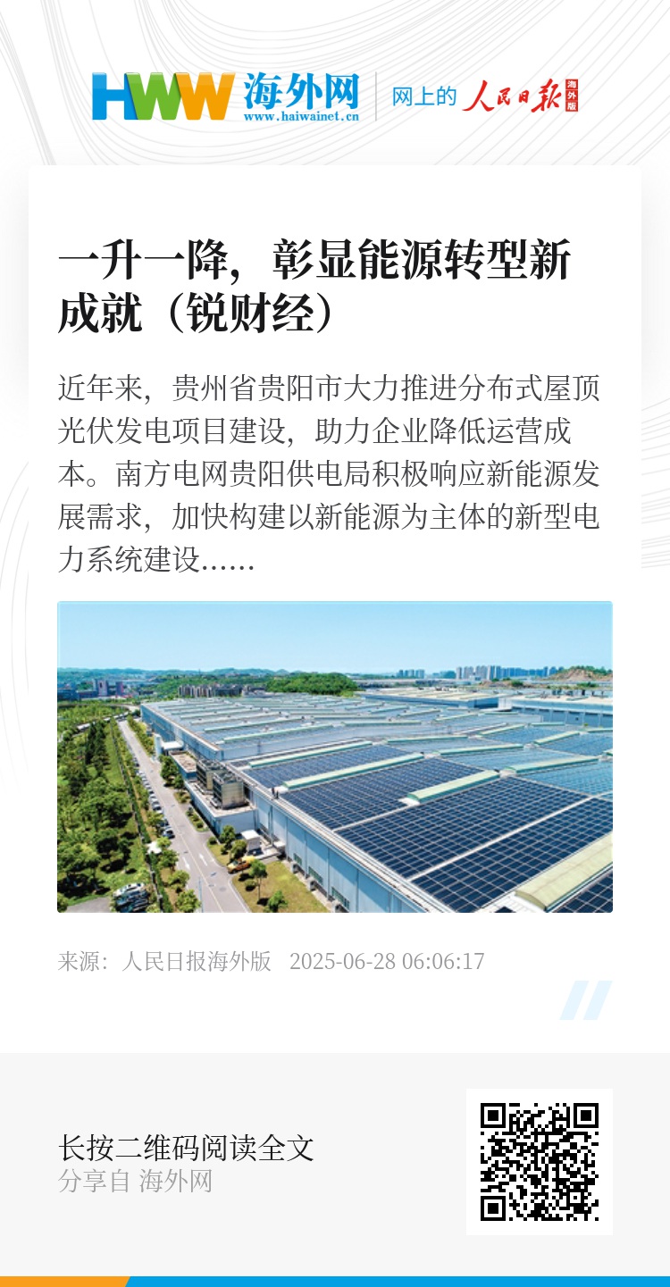 近年来,贵州省贵阳市大力推进分布式屋顶光伏发电项目建设,助力企业降低运营成本。南方电网贵阳供电局积极响应新能源发展需求,加快构建以新能源为主体的新型电力系统建设,支撑新能源的接入和消纳,推动当地经济绿色低碳发展。图为贵州吉利汽车制造有限公司屋顶光伏项目,源源不断产出清洁电能。万伟摄(人民视觉)