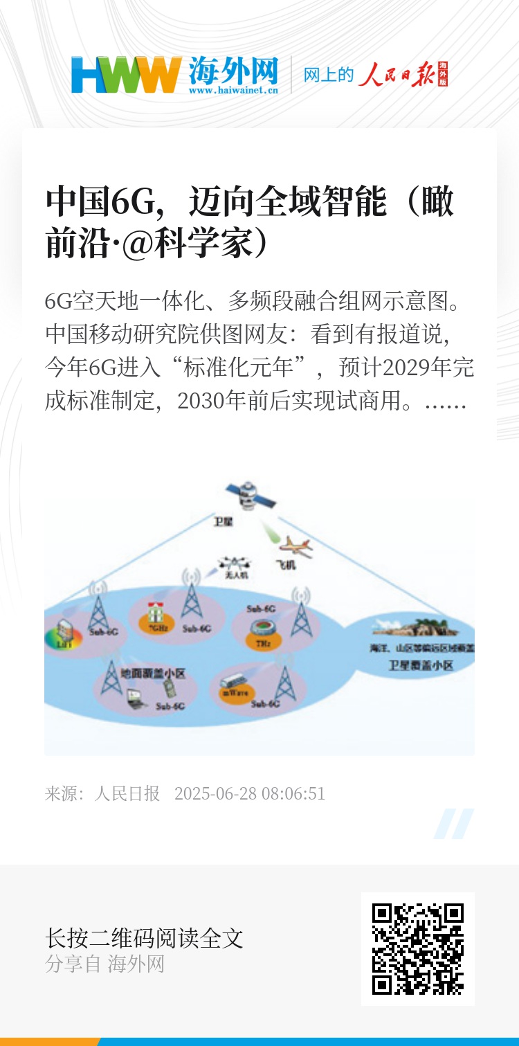 6G落地,标准要先行。在标准制定方面,我国已经有所布局。今年3月,工业和信息化部印发的《2025年工业和信息化标准工作要点》明确要求加强新兴产业标准建设,并提出加快构建新型信息基础设施标准体系,推进5G—A、低空信息基础设施、6G、量子保密通信等标准研究。今年6G技术标准研究已正式启动,预计2030年6G将具备商用能力。