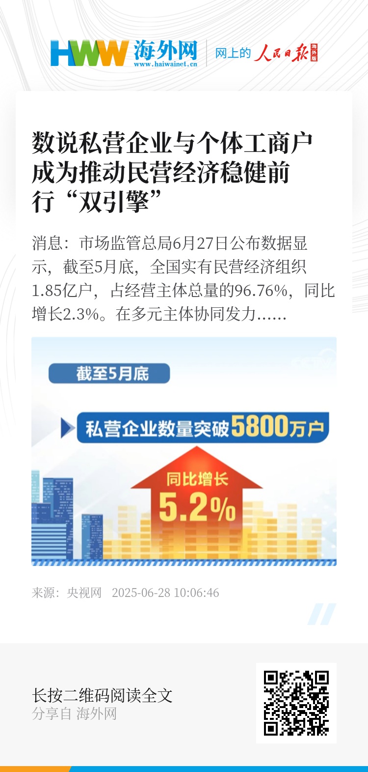 截至5月底,私营企业数量突破5800万户,同比增长5.2%。私营企业不断加大科技创新投入,在新能源、高端装备制造等战略性新兴产业领域持续发力,成为推动产业升级、稳定经济增长的重要支撑。
