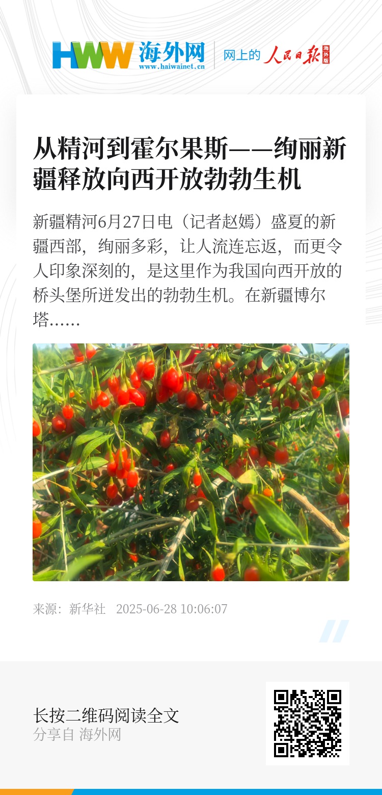 新华社新疆精河6月27日电(记者赵嫣)盛夏的新疆西部,绚丽多彩,让人流连忘返,而更令人印象深刻的,是这里作为我国向西开放的桥头堡所迸发出的勃勃生机。