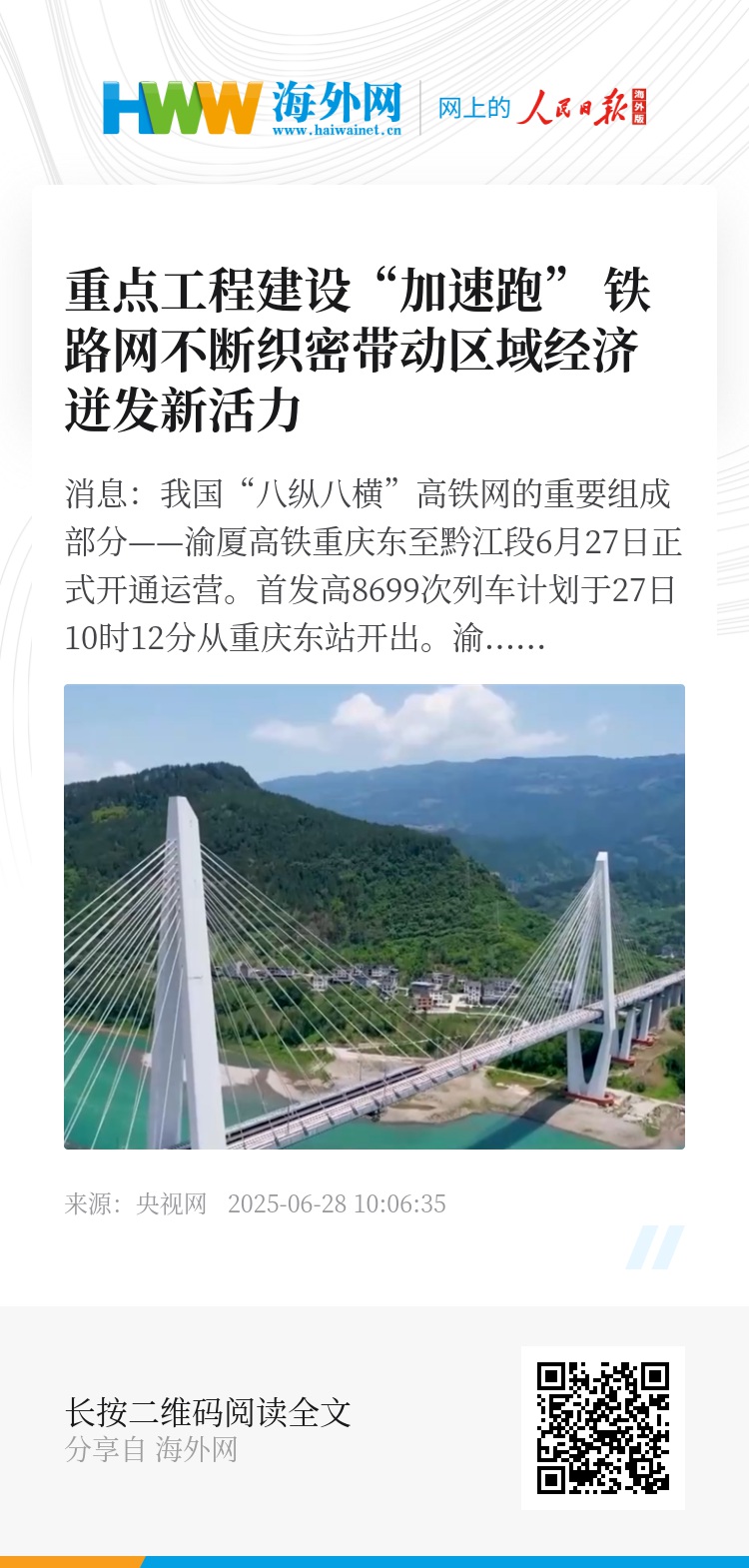 央视网消息:我国“八纵八横”高铁网的重要组成部分——渝厦高铁重庆东至黔江段6月27日正式开通运营。首发高8699次列车计划于27日10时12分从重庆东站开出。