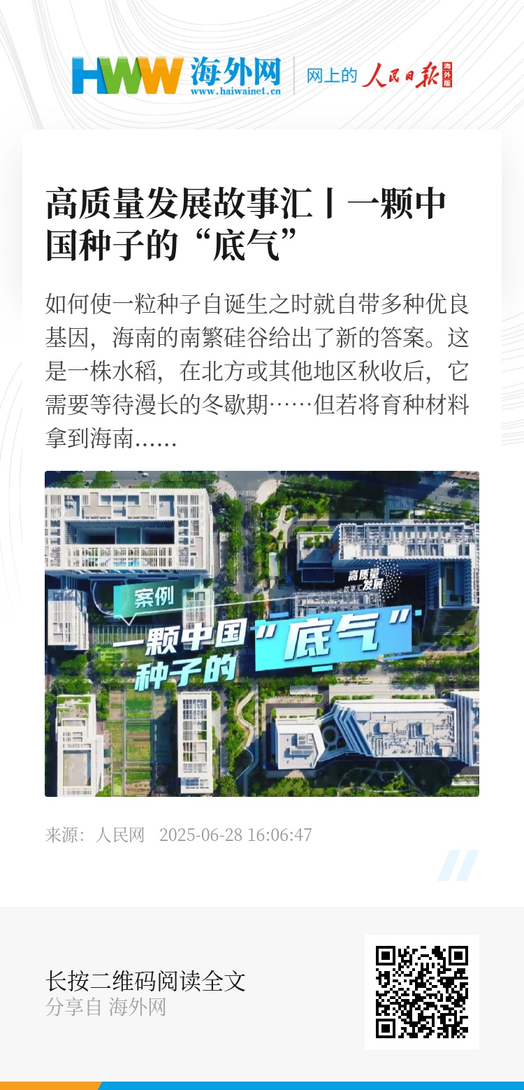 为中国种子装上“科技芯”,让每一粒种子都承载稳产增收的希望。如今的海南南繁科研育种基地,不仅是一个实现全年南繁的现代化育种中心,也成为“中国饭碗”坚实的底座,正在打造世界级种业创新引擎。