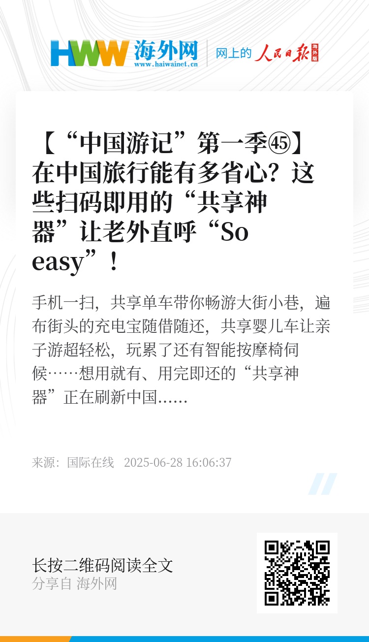 手机一扫,共享单车带你畅游大街小巷,遍布街头的充电宝随借随还,共享婴儿车让亲子游超轻松,玩累了还有智能按摩椅伺候……想用就有、用完即还的“共享神器”正在刷新中国旅行的舒适度,怪不得老外都大呼“So easy”!