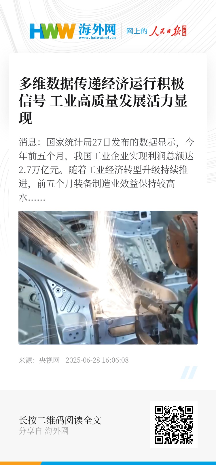 央视网消息:国家统计局27日发布的数据显示,今年前五个月,我国工业企业实现利润总额达2.7万亿元。随着工业经济转型升级持续推进,前五个月装备制造业效益保持较高水平。