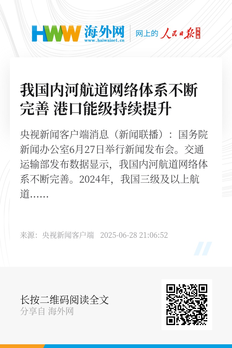 央视新闻客户端消息(新闻联播):国务院新闻办公室6月27日举行新闻发布会。交通运输部发布数据显示,我国内河航道网络体系不断完善。2024年,我国三级及以上航道达到1.6万公里,比2012年增长62%,长江、西江、京杭运河等主干线大通道能力持续提升,江汉运河、江淮运河建成通航,平陆运河等一批重大工程加快推进。