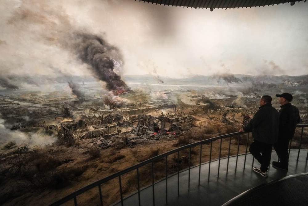4月1日,参观者在辽沈战役纪念馆内观看全景画《攻克锦州》。 新华社记者潘昱龙 摄