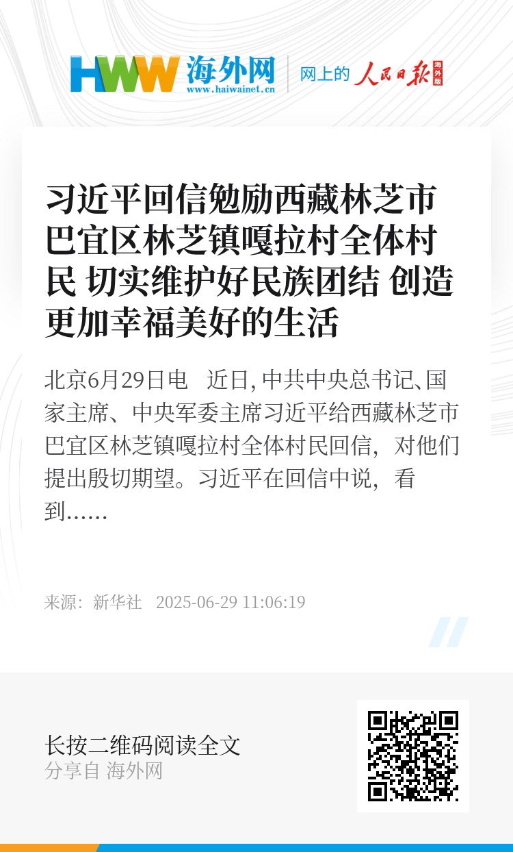 新华社北京6月29日电 近日,中共中央总书记、国家主席、中央军委主席习近平给西藏林芝市巴宜区林芝镇嘎拉村全体村民回信,对他们提出殷切期望。