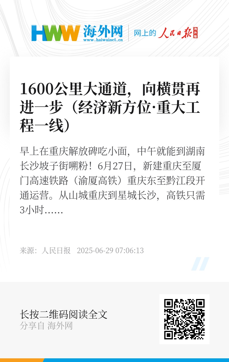 6月27日,新建重庆至厦门高速铁路(渝厦高铁)重庆东至黔江段开通运营。从山城重庆到星城长沙,高铁只需3小时53分。
