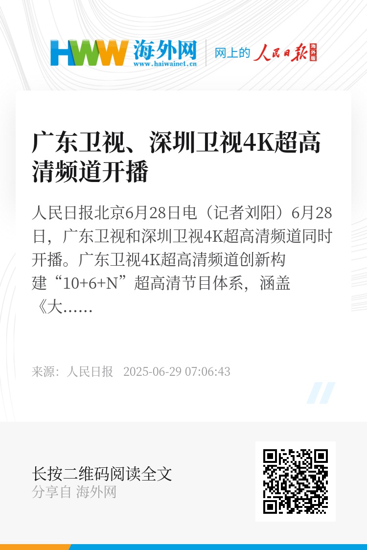 人民日报北京6月28日电(记者刘阳)6月28日,广东卫视和深圳卫视4K超高清频道同时开播。