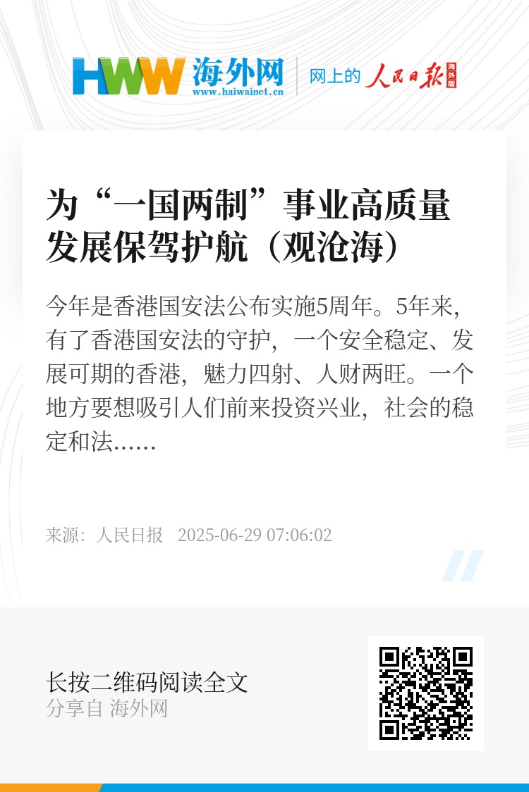 随着香港国安法的深入实施,香港进入了一个新的发展阶段,正处于开创新局面、实现新飞跃的关键期。相信有伟大祖国作坚强后盾,有香港国安法的保驾护航,有全体香港居民的团结奋斗,在强国建设、民族复兴伟业中香港必将大有可为、风光无限,不断开创“一国两制”事业高质量发展新局面。(江 琳)
