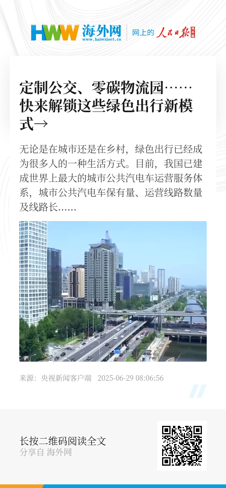 无论是在城市还是在乡村,绿色出行已经成为很多人的一种生活方式。目前,我国已建成世界上最大的城市公共汽电车运营服务体系,城市公共汽电车保有量、运营线路数量及线路长度均居世界第一。多层次、多样化的城市公共交通体系,让百姓的出行更加便捷。