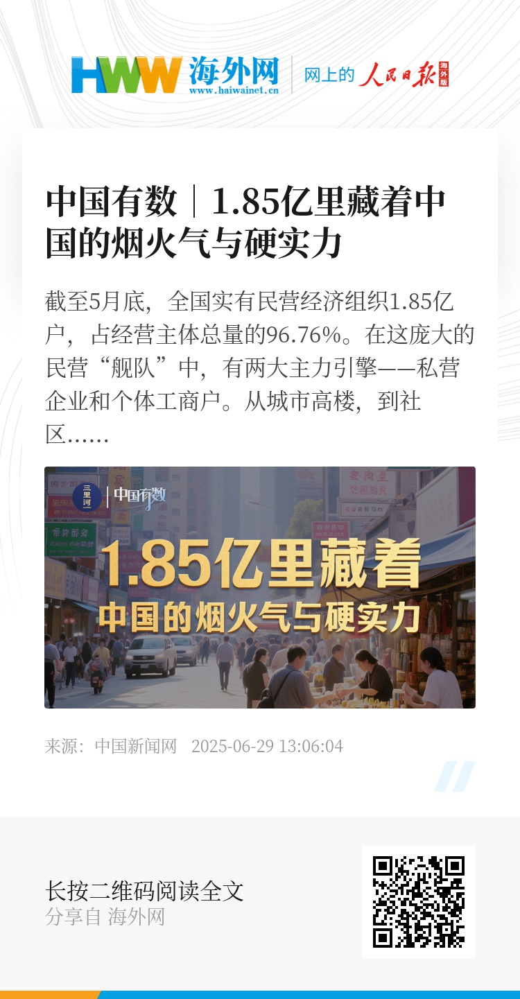 截至5月底,全国实有民营经济组织1.85亿户,占经营主体总量的96.76%。在这庞大的民营“舰队”中,有两大主力引擎——私营企业和个体工商户。从城市高楼,到社区小巷,民营经济撑起了中国烟火气,也托举着高质量发展的底气。(李雨昕 黄蕾 实习生 王艺杰)