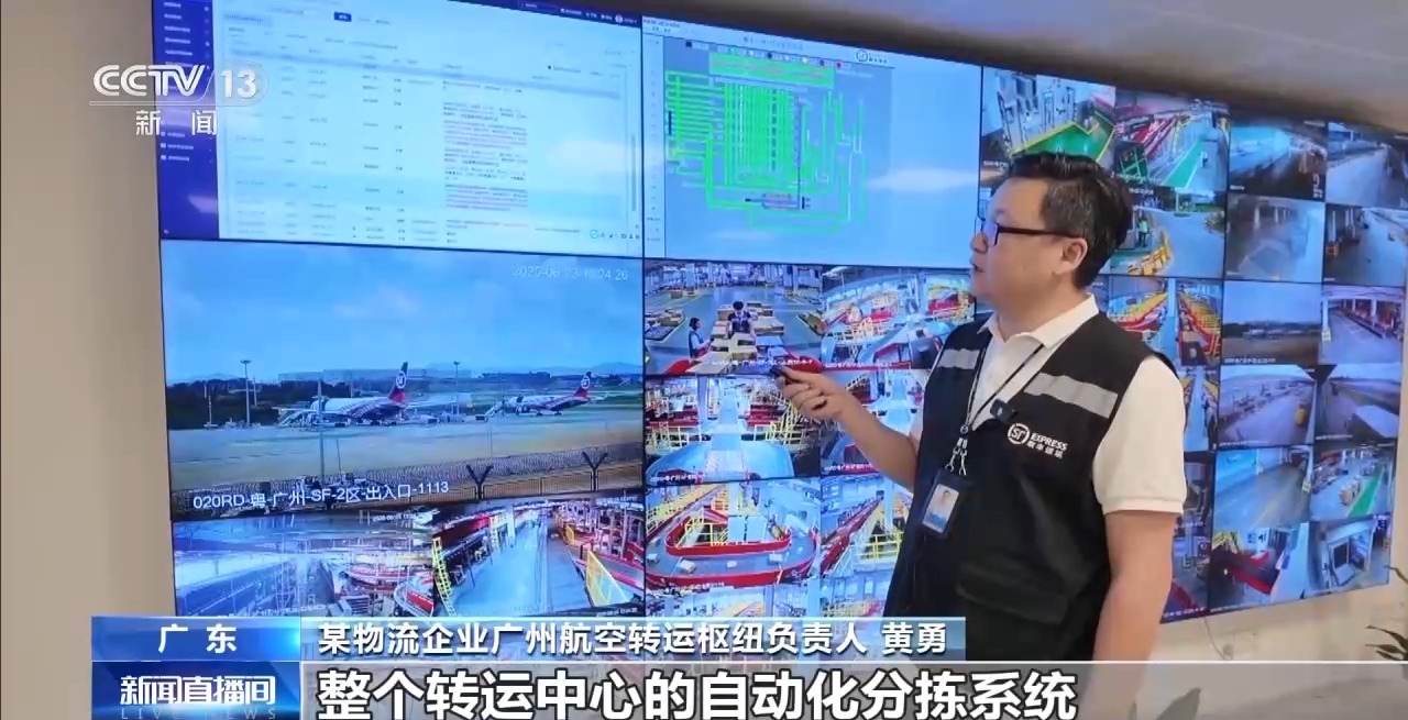 某物流企业广州航空转运枢纽负责人 黄勇:在12点54分,运用转运中心的自动化分拣系统,就已经分配到了航空的配载区域,再运用AI智慧系统,匹配相应的最优的时效航班,发运到指定目的地。