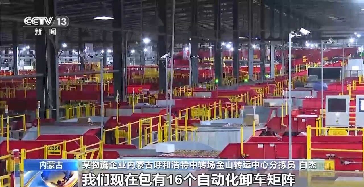 某物流企业内蒙古呼和浩特中转场金山转运中心分拣员 白杰:我们场地现在承接公路、铁路、航空的运输,现在有16个自动化卸车矩阵,从整个快件到达场地之后,我们只需要最快三分钟就可以完成快件的中转场的分拣。