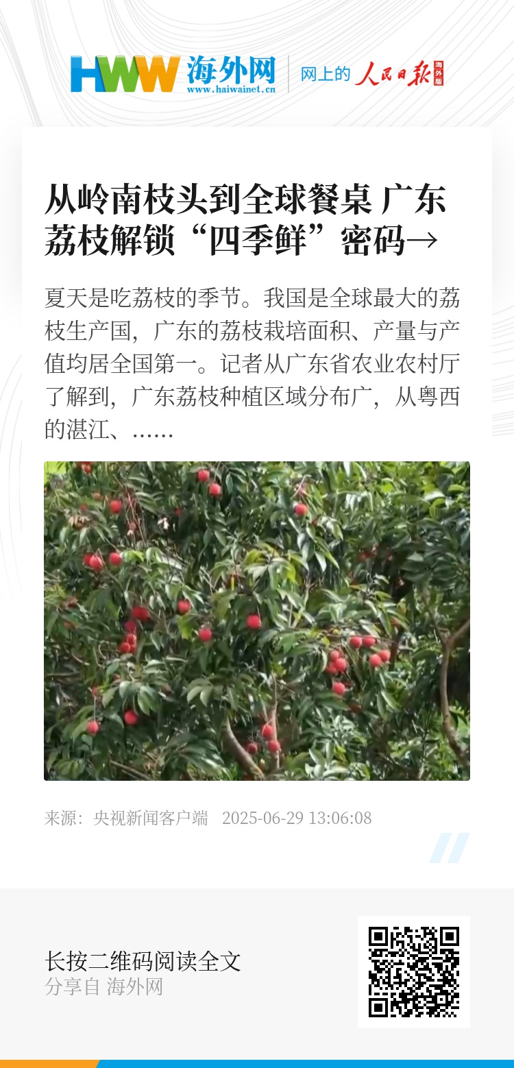 夏天是吃荔枝的季节。我国是全球最大的荔枝生产国,广东的荔枝栽培面积、产量与产值均居全国第一。记者从广东省农业农村厅了解到,广东荔枝种植区域分布广,从粤西的湛江、茂名,到粤东的惠州、汕头等地,不同产区的荔枝从5月中旬起开始,次第成熟,接茬上市,可持续到7月中旬。今年,广东荔枝栽培面积约420万亩,比去年增产三成左右。尽管今年的收购价低于去年,但因丰产带动,荔枝成为当地果农的“致富果”。