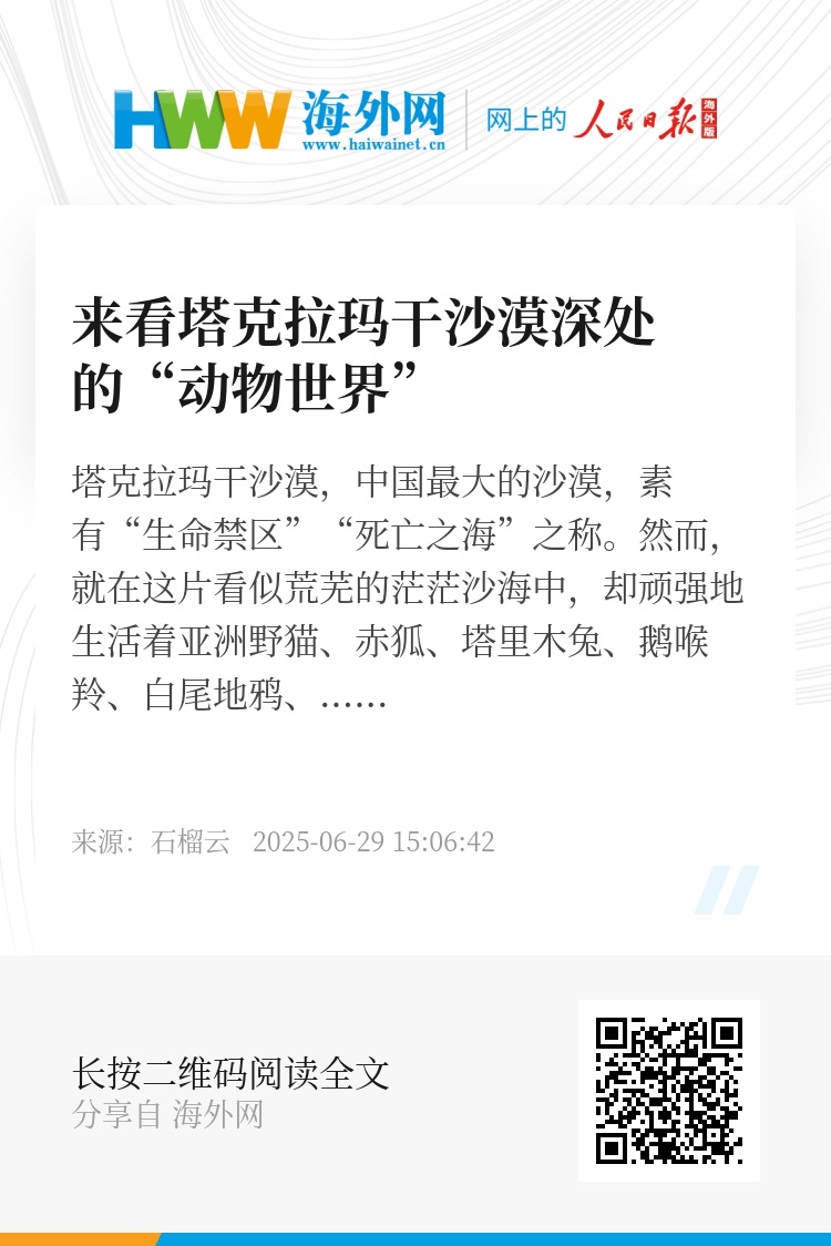 塔克拉玛干沙漠,中国最大的沙漠,素有“生命禁区”“死亡之海”之称。然而,就在这片看似荒芜的茫茫沙海中,却顽强地生活着亚洲野猫、赤狐、塔里木兔、鹅喉羚、白尾地鸦、戴胜鸟等各种野生动物。