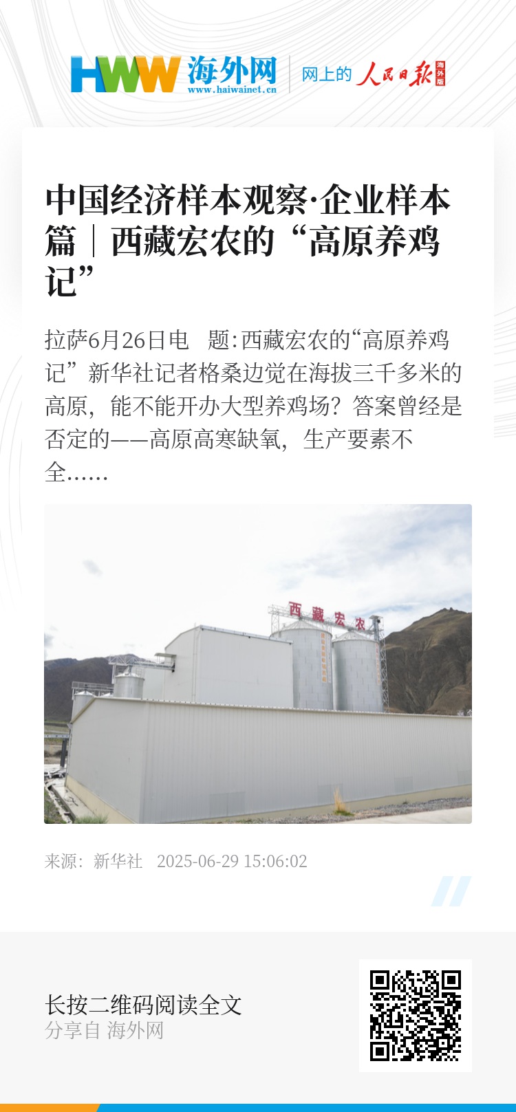 新华社拉萨6月26日电 题:西藏宏农的“高原养鸡记”