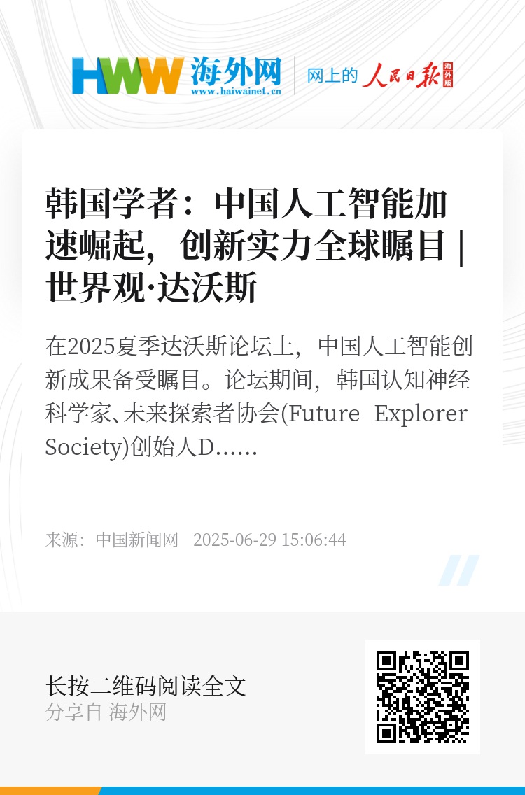 在2025夏季达沃斯论坛上,中国人工智能创新成果备受瞩目。论坛期间,韩国认知神经科学家、未来探索者协会(Future Explorer Society)创始人Dong-Seon Chang接受中新网采访时表示,中国在人工智能领域已成为世界领军者。中国通过战略性的人才培养模式,推动人工智能和机器人产业高速发展,在全球科技竞争中展现出强劲实力。(吴家驹 徐子婷)