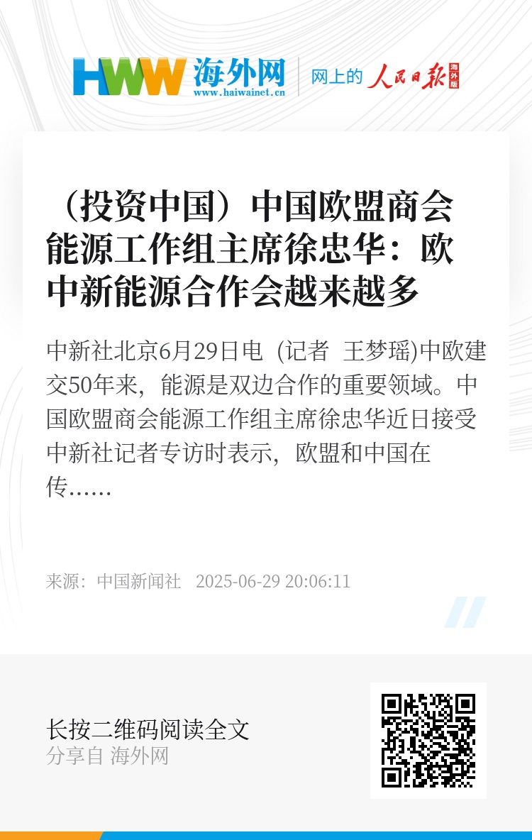 中新社北京6月29日电 (记者 王梦瑶)中欧建交50年来,能源是双边合作的重要领域。中国欧盟商会能源工作组主席徐忠华近日接受中新社记者专访时表示,欧盟和中国在传统化石能源领域具有共同的需要,未来在新能源方面的合作会越来越多。