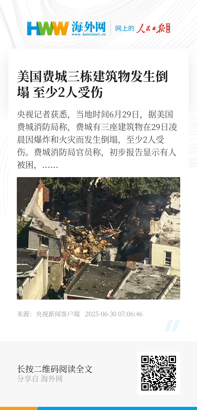 央视记者获悉,当地时间6月29日,据美国费城消防局称,费城有三座建筑物在29日凌晨因爆炸和火灾而发生倒塌,至少2人受伤。